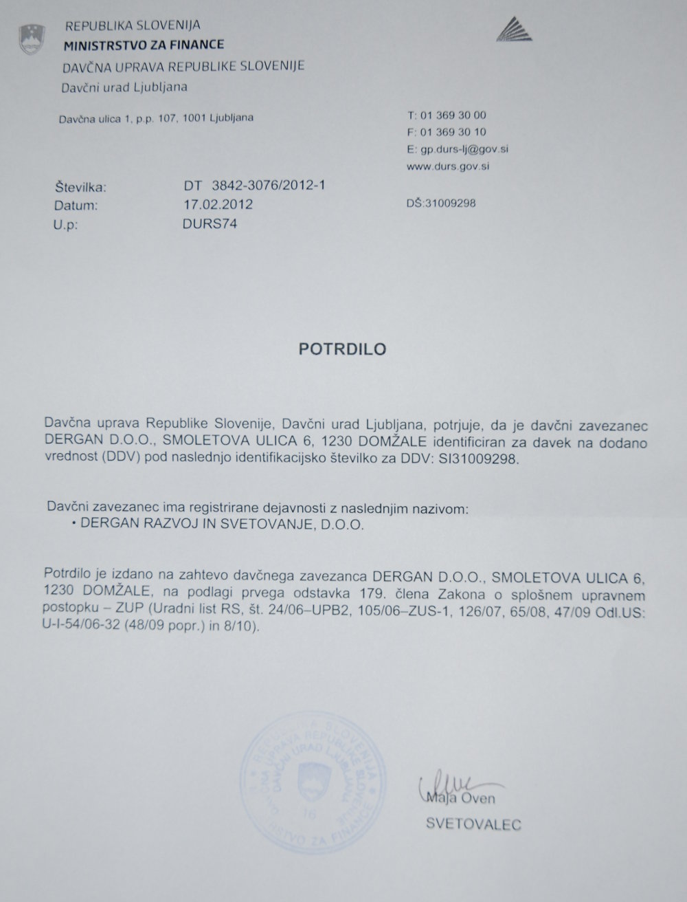 | Zavezanec za DDV? | da, ID SI31009298 - potrdilo |
